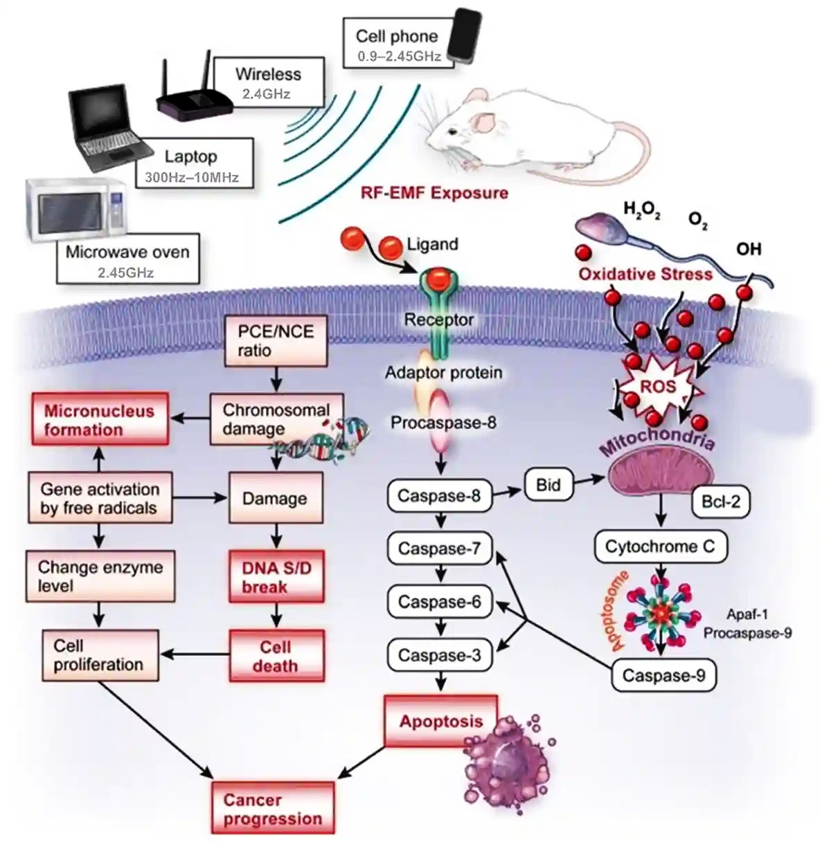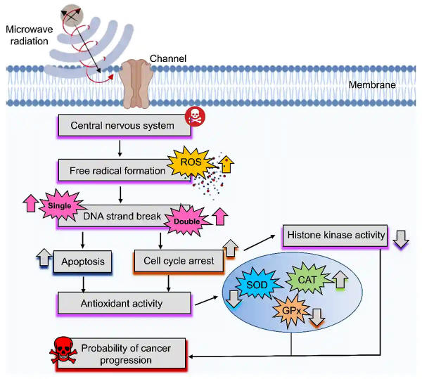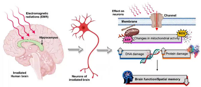 La radiación de microondas induce daño a las proteínas en las neuronas, cambia la actividad mitocondrial al influir en la formación de los niveles de ROS y ATP, y causa roturas en el ADN mono y doble, lo que conduce a la disfunción cerebral y disminuye la memoria espacial.